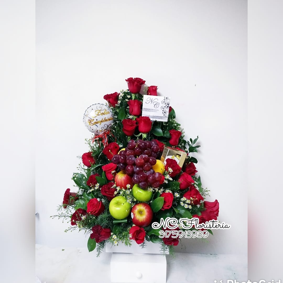 Arreglo Floral Rosas Rojas y Frutas